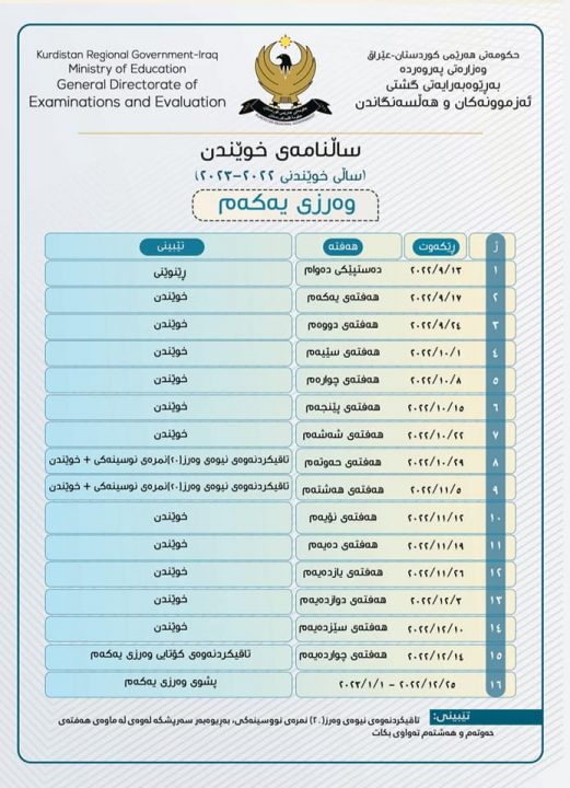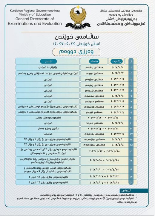 ئەمڕۆ یەکشەممە 28-08-2022 وەزارەتی پەروەردەی هەرێمی کوردستان، نووسراوێکی ئاراستەی بەڕێوەبەرایەتیی گشتیی پەروەردەکانی (هەولێر، سلێمانی، دهۆک، هەڵەبجە، گەرمیان، زاخۆ، سۆران و ڕاپەڕین) کردووە و داوا دەکات ئەم ساڵنامەی نوێیەی خوێندن لە گەشت ناوەندەکانی خوێندن جێبەجێ بکرێت.