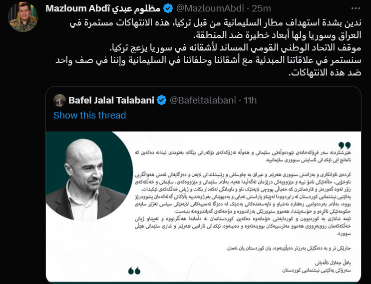 مەزڵوم کۆبانێ فەرماندەی گشتی هێزەکانی سوریای دیموکرات(هەسەدە) لە تویتێکدا رایگەیاند:” بە توندی ئێدانەی هێرشکردنە سەر فڕۆکەخانەی سلێمانی لەلایەن تورکیاوە دەکەین، ئەم پێشلکارییانە لە عێراق و سوریا بەردەوامن و هەڕەشەی جددین لەسەر ناوچەکە”.
